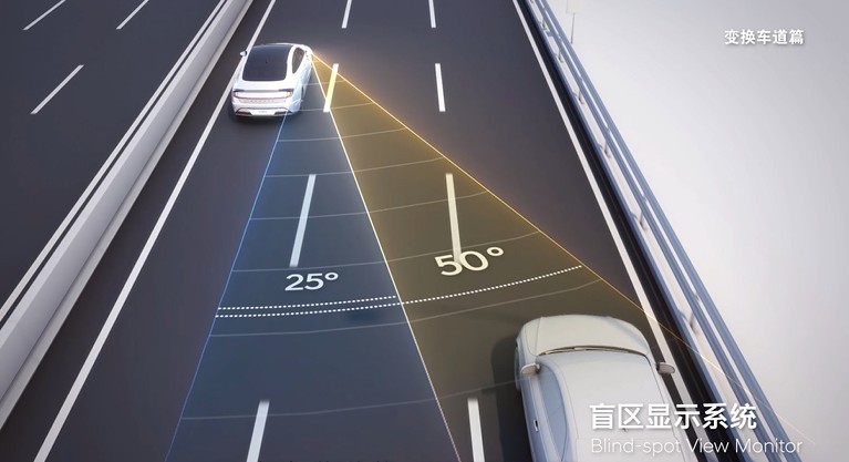 必须要强调的是,BVM盲区显示系统可以提供多达50°的大视角,相当于在普通外后视镜的25°视角之上额外增加了25°。这让车主不仅可以看到与自己相邻的车道,还可以看到第三条车道。