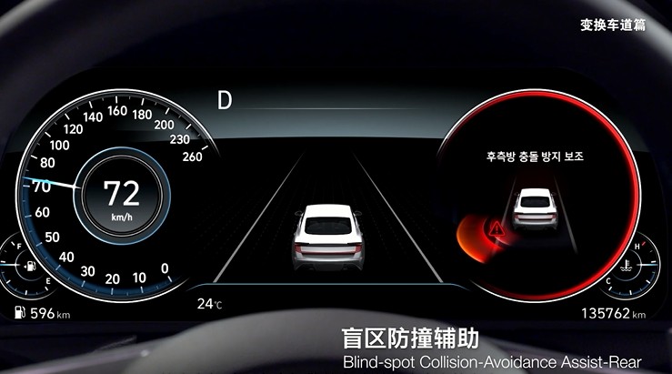 这种情况下,第十代索纳塔的BVM盲区显示系统就派上用场了。第十代索纳塔的外后视镜上安装有广角摄像头,当车主打开转向灯,摄像头就会开始工作,将后侧方盲区的实时影像显示在仪表盘上。这样,驾驶员就不用再回头去看了,而是直接利用余光看到仪表盘上显示的盲区图像,获得一份视野的参考,进而可以更安全地变道。