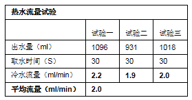 通过计时30s,对额定时长下冷、热出水量进行计量测试,再换算出热水流量,测试结果如下: