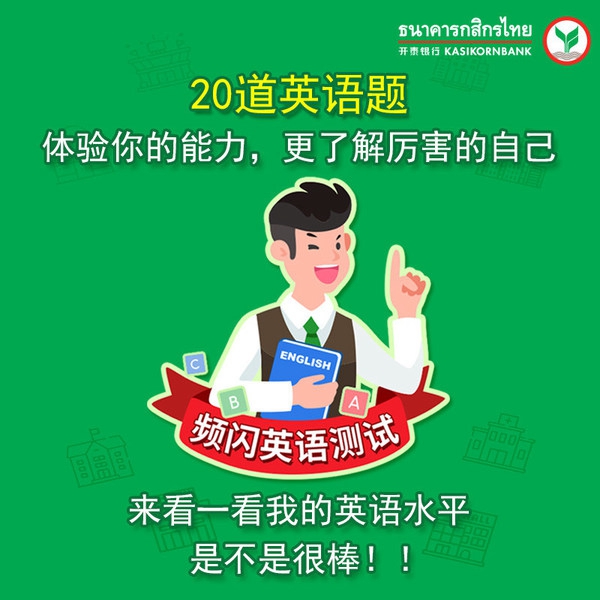 次周回归英语测试,为了大家发现自己的英语水平。因语言技能越发重要,开泰银行邀请大家通过K-Town小镇的“频闪英语测试”,来测试英语水平。