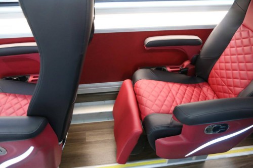 车厢内部采用了右1左2的座椅布置形式,所有座椅均采用了酒红与雅黑双拼的高端软座。座椅左右两边均设置了扶手,前部还设置了脚托,可以根据乘客的需求来进行角度调节。