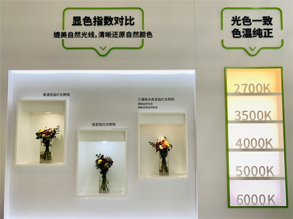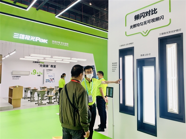 然而大多数人对教室光环境的需求并不清晰,以为够亮就是健康照明。事实上,专业的教室照明还有以下五个维度:眩光指数、显色指数、光频闪指数、色温、蓝光危害。为了让更多教育工作者了解专业教室灯具的重要性,三雄极光在展位现场分别设置了频闪对比区、色温对比区、显色指数对比区。