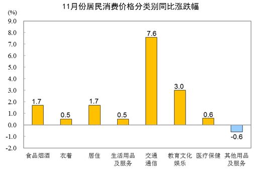 其他七大类价格同比六涨一降。其中,交通通信、教育文化娱乐、居住价格分别上涨7.6%、3.0%和1.7%,医疗保健、衣着、生活用品及服务价格分别上涨0.6%、0.5%和0.5%;其他用品及服务价格下降0.6%。
