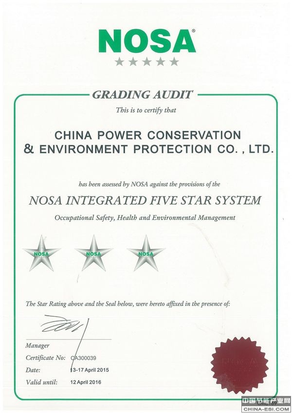 让我们可喜的是,已经有环保企业主动迈出了与更高国际标准接轨的第一步:今年4月17日,北京国能中电节能环保技术有限责任公司经过南非职业安全协会(NOSA)科学、严格地考评,被正式授予“NOSA五星管理系统”三星级证书。这是中国首家通过“NOSA五星管理系统”认证的环保企业,开启了中国环保第三方治理引入高水平国际化安全管理体系的先河。首次迎检便被评为“三星级企业”,充分说明国能中电的运营服务水平处于国内行业领先的地位。国能中电董事长白云峰表示:“这是对公司管理尤其现场运行维护和安全管理水平的国际化认定,含金量很高。我们环保设施第三方委托运营的项目,就是以这样的标准为业主服务的。真心希望环保行业整体都能达到五星水平!”