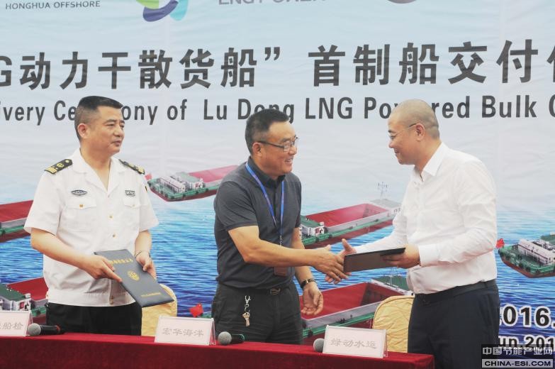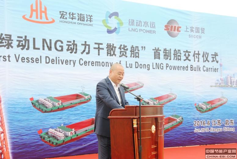 2016616日上午,江苏启东宏华海洋油气装备(江苏)有限公司造船现场,在全球第一大造船吊机的背景下,绿动水上运输有限公司在宏华海洋油气装备(江苏)有限公司订造的大批量纯LNG动力内河干散货船的首制船交付仪式在盛大举行。