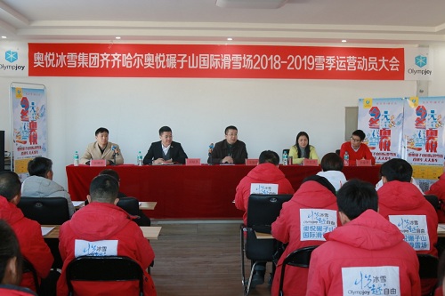 奥悦冰雪集团齐齐哈尔奥悦碾子山国际滑雪场2018-2019雪季运营动员大会于2018年11月27日在雪场召开,奥悦集团总裁王楚权,集团监事会主席刘文洁等出席大会。期间,与会领导就碾子山滑雪场2018目标分解、2017运营季总结、奥悦集团廉政自律承诺等专题内容进行发言。会上,集团与子公司,子公司与各部门负责人签署了相应的目标责任书,员工代表也进行了慷慨激昂的表态发言。