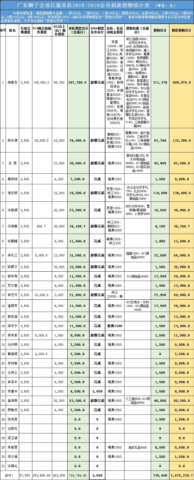 袁景俊狮兄3,000元、周彩燕狮姐2,200元、吴少能狮兄2,000元、冯浩宇狮兄1,000元、潘伟科狮兄1,000元、郑咏梅狮姐1,000元、陈叶秋狮兄1,000元、刘汝君狮姐1,000元、朱建荣狮兄1,000元、李海强狮兄1,000元、张翅狮兄1,000元、段喜庆狮兄400元