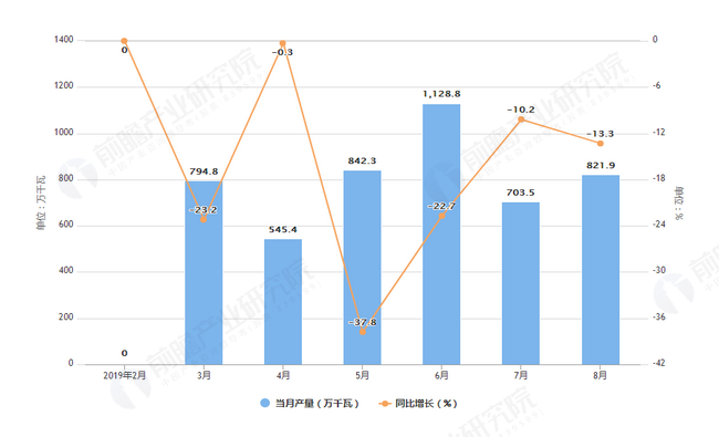 国家统计局统计数据显示,2019年7月全国发电机组产量为703.5万千瓦,同比下降10.2%,2019年8月全国发电机组产量为821.9万千瓦,同比下降13.3%,2019年1-8月全国发电机组产量为6160.1万千瓦,累计下降18.2%。