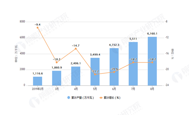 2019年1-8月全国发电机组产量及增长情况图