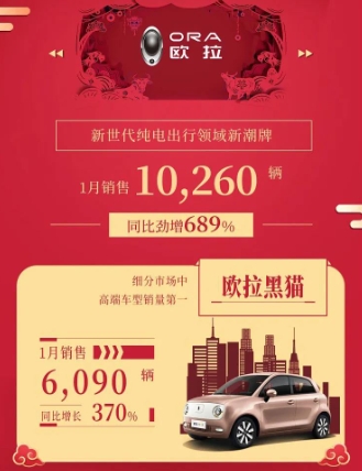 而要说到当下都市年轻人关注较多的,当属“新势力领军品牌”欧拉。在刚刚过去的1月,其共销售新车10,260辆,同比劲增689%,实现了连续3个月销量破万的好成绩。旗下欧拉黑猫更是凭借月销6,090辆,同比增长370%的数据,再次荣膺5-10万元级纯电细分市场销量冠军,成为令同行羡慕的存在。