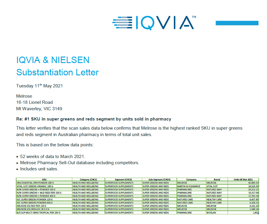 根据全球医疗健康行业咨询公司领导者IQVIA艾昆纬的最新数据显示,Melrose绿植精粹粉在过去的一年中(2020年2月-2021年3月期间),力压澳达利亚本土最知名的营养品品牌Natural's Way,Bioglan及Healthy Care等,获得植物精粹粉类超级食品销量冠军。