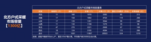 然而这并不意味着农村空气源热泵前景渺茫,相反,农村空气源热泵市场蕴藏着千亿商机!据不完全统计,我国北方和南方分别拥有121、294个地级市,1001、2365个县城,11867和31143个乡镇,以5%~10%的富裕户和新装修户计算,每镇约1000户,每村约50~60户,家庭户数按平均4人/户,普及10%户数计算,采暖机平均每户按25000元/台计算,北方乡镇户式采暖市场容量为1300亿元;热水机平均每户按5000元/台计算,乡镇热水市场容量为658亿。综上所述,在农村地区,仅家用采暖和热水市场规模可达1958亿元。
