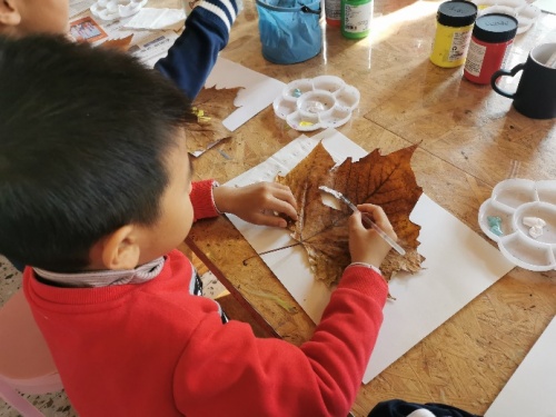 每一片落叶都像是一幅画,自己就诠释了一个故事,同学们在落叶上涂涂画画就变成了一张张小脸谱。