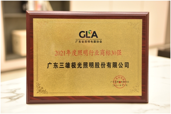 会上,主办方对2021年在社会公益、行业发展等领域做出积极贡献的优秀照明企业进行了颁奖表彰,三雄极光荣获“照明行业商标30强”、“广东省照明行业重点商标培育示范企业”、“热心公益企业”三项殊荣。