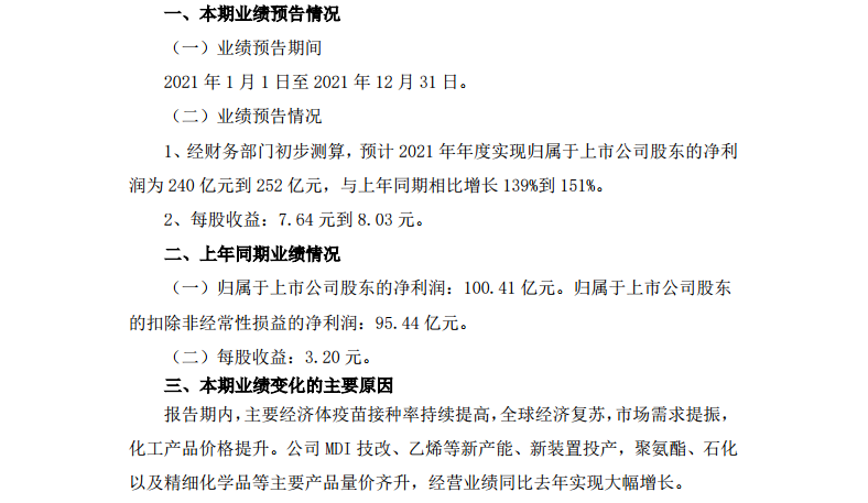 1月17日,万华化学集团股份有限公司(万华化学,600309)公告称,预计2021年净利润240亿元至252亿元,同比增长139%-151%。每股收益7.64元到8.03元。