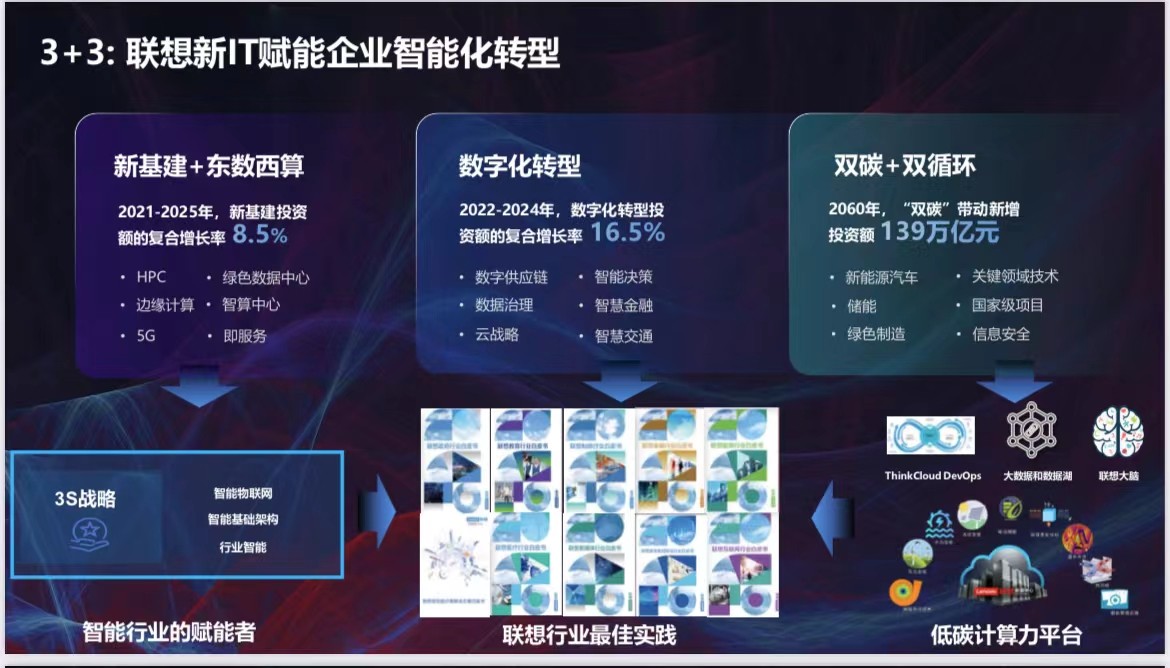 在国家高度重视数字化和绿色化协同发展的背景之下,智能化转型与科学零碳需求,已逐步成为了经济脱胎换骨、绿色发展的关键抓手。联想集团副总裁、中国区基础设施业务群行业销售总经理刘文超表示,联想基于“端-边-云-网-智”技术架构对外输出智能化转型解决方案的同时,也将持续外化绿色创新技术与服务,引领制造行业的可持续发展。