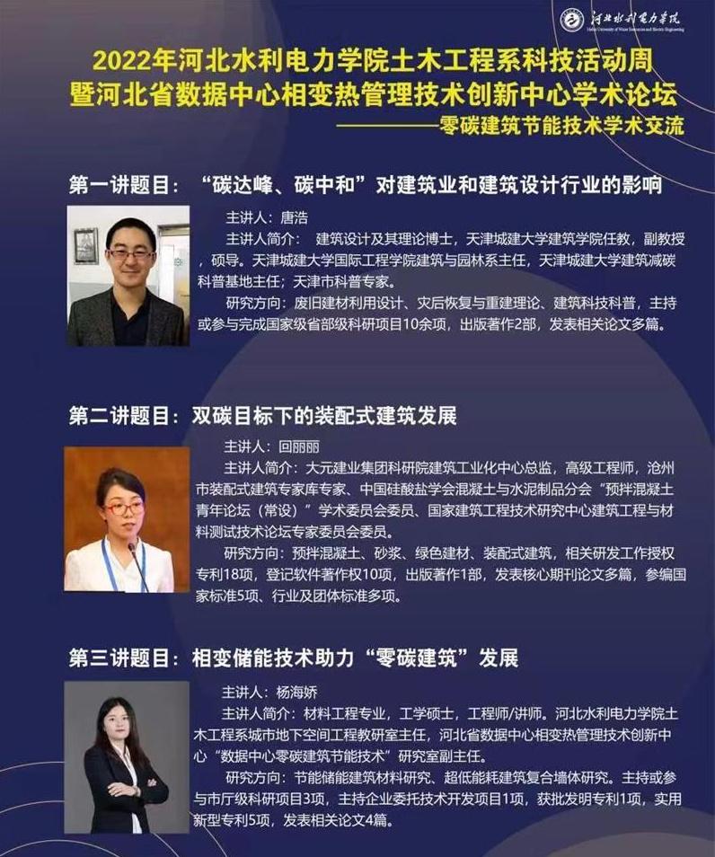 会议邀请天津城建大学国际工程学院建筑与园林系主任唐浩、大元建业集团科研院建筑工业化中心总监回丽丽,以及河北水利电力学院城市地下空间工程主任杨海娇做了学术报告。唐浩副教授以“碳达峰、碳中和”对建筑业和建筑设计行业的影响为主题,详细分析了建材生产和建筑运行阶段降碳的途径和入手点。回丽丽总监的报告聚焦双碳目标下的装配式建筑发展,图文并茂地介绍了装配式建筑的历史、现状及发展方向。杨海娇老师做了主题为相变储能技术助力“零碳建筑”发展的报告,介绍了相变蓄热墙体的制备、性能分析以及其在超低能耗被动式建筑领域应用的可行性。