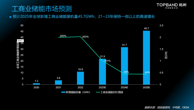 根据国家能源局、中电联、CESA预计数据,2025年全球新增工商业储能装机量将达到45.7GWh,市场空间广阔。