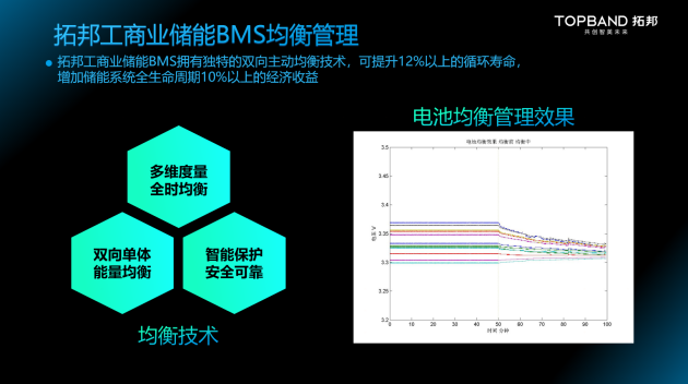 均衡管理:拓邦工商业储能BMS拥有独特的双向主动均衡技术,预估可提升12%以上的循环寿命,增加储能系统全生命周期10%以上的经济收益。