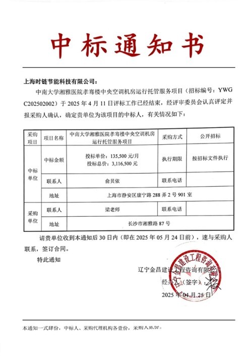 日前,时链科技在医院综合能源托管服务领域再传捷报!继成功中标深圳市第二人民医院项目后,时链科技凭借领先的智慧能源管理技术与丰富的综合能源运维服务经验,成功中标中南大学湘雅医院中央空调机房运行托管服务项目。