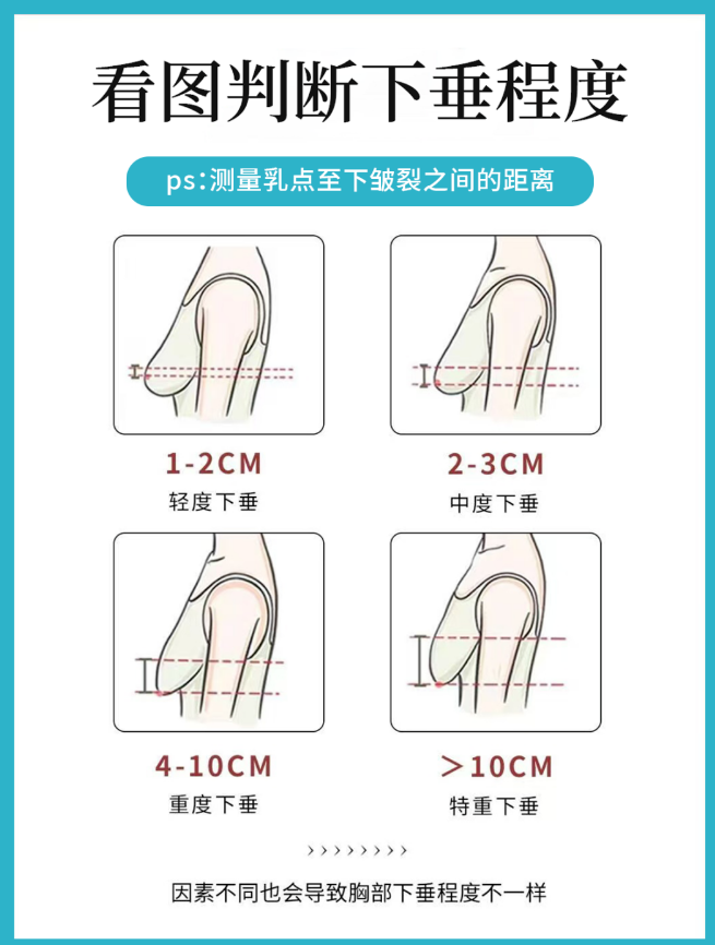 一般会把胸下垂的程度分为3个等级, 按照乳头和乳房下折叠处的位置来做判断。