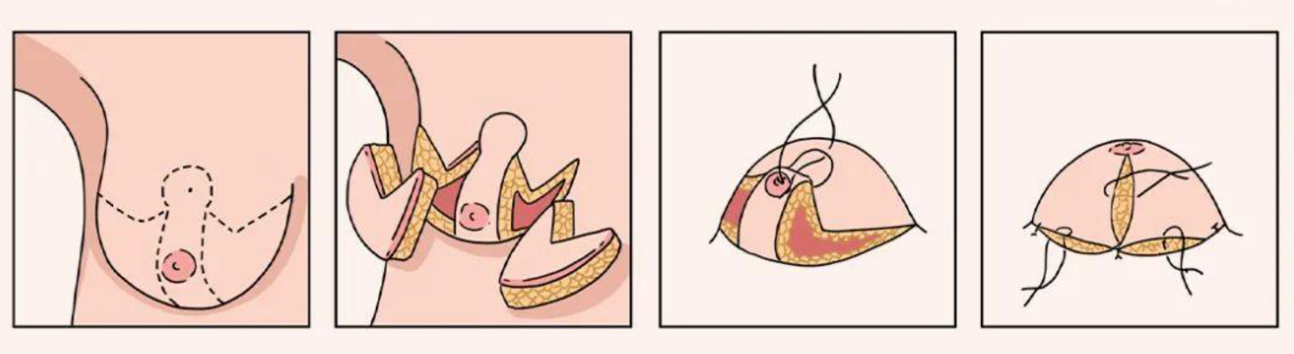 乳房悬吊术是将下垂的乳头及乳房组织进行提升并固定到正常的位置上,一些松弛下垂严重的还要切除多余的乳房腺体和皮肤,切除过大的乳晕,将乳头乳晕“旋转”移动到合适的位置,将乳房腺体重塑成半球形,并固定。