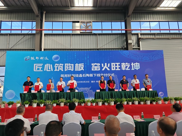 八月的荣昌,窑火炽盛。8月20日,以“匠心筑陶板·窑火旺乾坤”为主题的筑邦科技硅晶石陶板下线交付仪式,在筑邦绿建产品生产基地圆满举行。