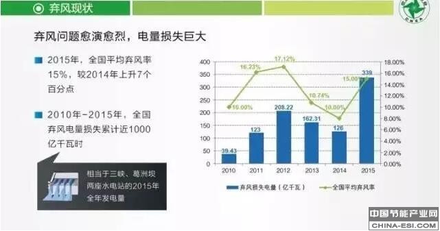 2015年弃风电量339亿千瓦时,直接经济损失超过180亿元。今年弃风问题进一步加剧,会上国家能源局新能源和可再生能源司李鹏处长提到,初步统计去年弃风限电电量超过500亿。