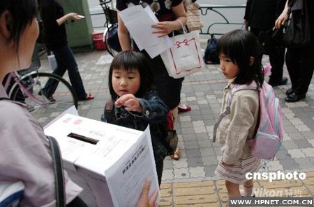 5月18日,一位日本小朋友为四川灾区捐款。当日,日本侨报社创办的“星期日汉语角”参加者来到繁华的池袋车站进行街头募捐。