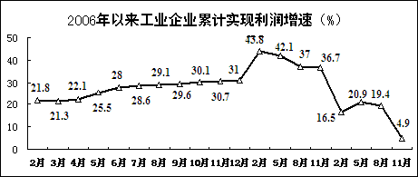 工业企业利润增幅回落,亏损额大幅上升。1-11月,规模以上工业企业累计实现利润24066亿元,同比增长4.9%。增幅比1-8月回落14.5个百分点,同比回落31.8个百分点。亏损企业亏损额4879亿元,增长1.8倍。国有及国有控股企业利润7985亿元,下降14.5%;亏损企业亏损额3199亿元,增长3.4倍。