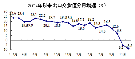 工业品出口增势继续放缓。2008年,规模以上工业企业出口交货值80844亿元,比上年增长10.8%,增幅同比回落10.7个百分点。其中,11月、12月同比分别下降5.2%和8.8%。