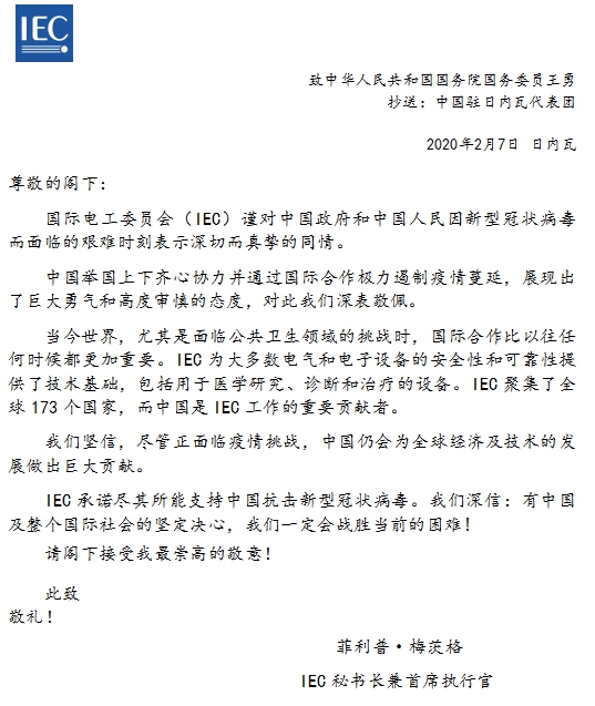 近日,从国际电工委员会(IEC)官方媒体获悉,IEC秘书长兼首席执行官菲利普·梅茨格在网站上发表公开信,代表IEC对我国抗击新型冠状病毒表示高度关切,积极评价、深表敬佩我国政府团结带领全国上下全面遏制疫情蔓延所作出的努力,对我国打赢疫情防控阻击战、继续为全球经济及技术发展作出巨大贡献充满信心,并表示全力支持我国抗击新型冠状病毒。
