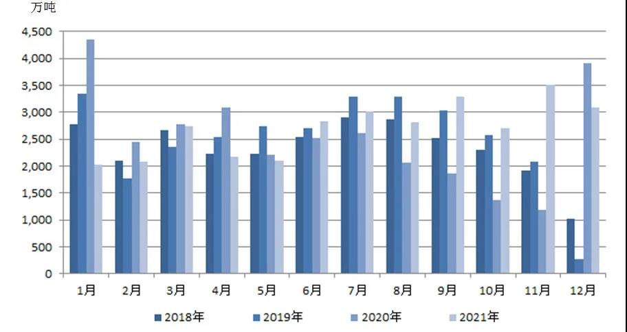 2021年12月正值仲冬时节,特别是12月中旬后,两次寒潮强冷空气影响我国大部地区,造成大范围强降温、雨雪和大风天气,对煤炭运输造成一定影响,环渤海港口库存波动中小幅回落,但与往年相比仍处高位。2021年12月31日,北方九港库存合计2193.5万吨,较2020年同期增加379.6万吨;秦皇岛港库存474万吨。另据港口生产快报,2021年,环渤海港口发运煤炭约为7.43亿吨,同比增加约5000万吨。其中,秦皇岛港和京唐三港、能源集团天津煤码头完成煤炭吞吐量同比2020年基本持平,黄骅港完成吞吐量同比增长约为1000万吨;而煤炭运量增幅最大的当属曹妃甸四港,四港合计完成煤炭吞吐量同比大幅增加4000万吨。