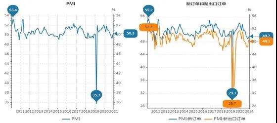 保供稳价政策持续推动原材料价格回落,且电力供应能力提升,制造业生产活动显著加快。2021年12月制造业PMI为50.3%,比11月上升0.2个百分点,连续两个月位于扩张区间。非制造业PMI为52.7%,较前值上升0.4个百分点。从制造业供需来看,一方面生产指数51.4%,仍处于扩张区间,但较11月回落0.6个百分点,生产活动增速出现季节性回落,而原材料价格回落至荣枯线以下至48.1%,上游成本端压力逐渐缓解,企业利润延续改善趋势,供给端仍有望保持增长。相比之下,受疫情反复影响,海外需求进一步收缩,新出口订单指数及在手订单指数回落,需求端边际改善的确定性不强。未来,需求端压力将取代成本端压力,成为下一个阶段经济运行的主要矛盾,稳增长、促内需尤为重要。