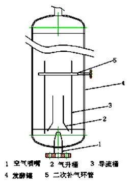 (2)新型气升式二次补气发酵技术:增加发酵罐高度,利用文丘里管的喷射搅拌作用代替搅拌电机,可省去发酵罐搅拌电动机,克服了普通的气升式发酵罐内的导流筒只有导流作用、不能调节温度的难题。本技术的导流筒具有调温和导流两种作用,并且为双面换热,高效节能;同时,导流桶中上部增加二次补气环管,管内空气向下喷射,利用发酵罐内循环液把此部分空气带回到空气喷嘴处,再与发酵液混合向上喷入气升桶,提高发酵液溶氧率和空气利用率,从而降低生产成本。