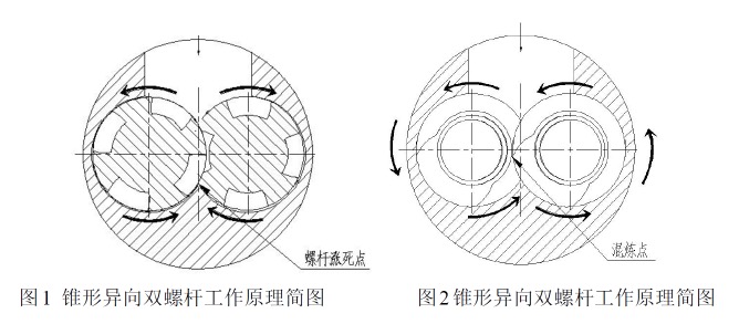 (1)锥形螺杆的同方向旋转使加工的物料进入机筒后环绕锥形双螺杆成”∞”字形运动,增加了塑化时间和密炼性能,从而保证了产品的塑化质量;