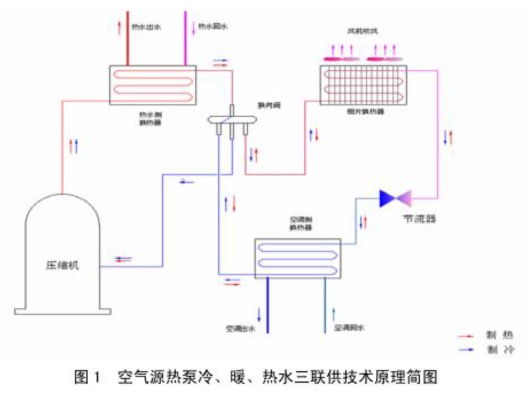 空气源热泵冷、暖、热水三联供技术原理见图1。