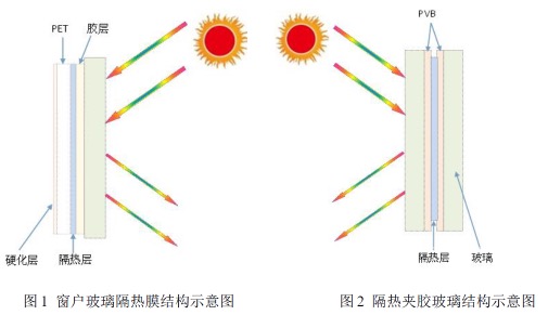 隔热夹胶玻璃结构主要包括玻璃、PVB胶膜和隔热膜。其中,PVB主要起与玻璃粘结的作用,赋予玻璃防碎防爆的安全功能;隔热层具有阻隔紫外线和红外热线的作用,其结构原理如图2所示。