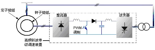 反馈式高频斩波串级调速—— 现代串级调速技术是固定逆变器的逆变角,通过高频 PWM 调制控制大功率电子开关的开通与关断时间,改变串入转子回路的等效电势大小,并将转差功率经逆变变压器反馈回电网达到高效调速节能的目的。